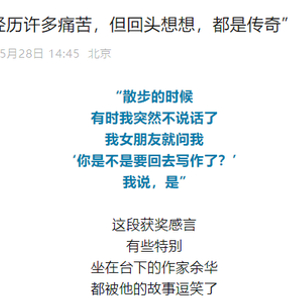 这位在网络上爆火的青年作家刘楚昕,是湖北省社科院哲学研究所助理研究员,武汉大学哲学博士毕业。刘楚昕在广西发表获奖感言时说,2017年他在武汉大学读博期间,遇到了初恋女友,那个时候他沉迷于写作。有时候“散步的时候我突然不说话了,我女朋友就问我‘你是不是要回去写作了?’我说,是”。这段获奖感言,让坐在台下的作家余华,也发出“写作沉迷者”之间共鸣的微笑——第二届漓江文学奖由著名作家余华担任评委会主任。