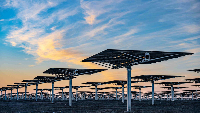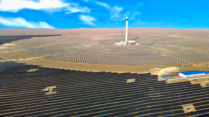 在247米高的吸热塔下,25594面定日镜追随着太阳的轨迹,而广阔的光伏板阵列则如饥似渴地吸收阳光,将其转化为澎湃电能。