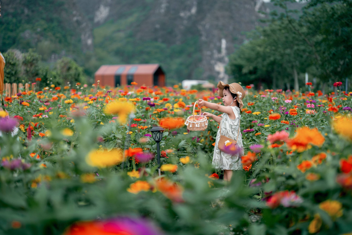 踏入田东县祥周镇模范村龙潭灵湖景区,大片花海如绚丽织锦铺展眼前,橙红、明黄、粉紫三色花朵肆意绽放,可爱的小女孩手提花篮穿梭其中,为这片花海增添了灵动的童趣。(田东县纪委监委供 谭敏/摄)