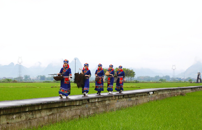 柳城县古砦仫佬族乡的姑娘们身着精美的民族服饰,手拿农具,穿梭在稻田之间。八桂大地壮美画卷,每一帧都是动人心魄的美好瞬间。(柳城县纪委监委供 覃韵/摄)