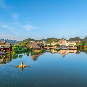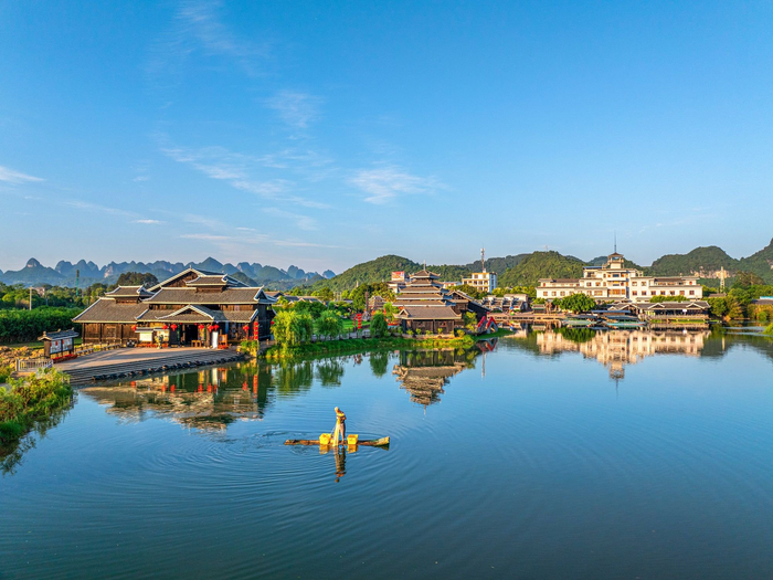 五月,阳朔县燕子湖宁静秀美,连绵的山峦,错落的屋舍静静地倒影在水面,渔夫划着竹筏悠然驶过,宛若世外桃源。(阳朔县纪委监委供 夏立慧/摄)