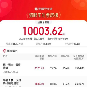 2025六一档票房破亿 界面新闻 界面新闻官方账号 2025.06.0113:52 关注 据猫眼专业版数据,截至6月1日13时49分,2025年六一档(6月1日)票房破亿,《碟中谍8:最终清算》《哆啦A梦:大雄的绘画奇遇记》《时间之子》分列六一档票房榜前三位。