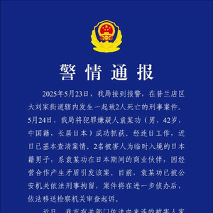 大连公安局6月3日通报,5月23日,大连市公安局接到报警,在普兰店区大刘家街道辖内发生一起致2人死亡的刑事案件。5月24日,大连公安局将犯罪嫌疑人袁某功(男,42岁,中国籍,长居日本)成功抓获。经连日工作,近日已基本查清案情。2名被害人为临时入境的日本籍男子,系袁某功在日本期间的商业伙伴,因经营合作产生矛盾引发该案。目前,袁某功已被公安机关依法刑事拘留,案件将在进一步侦办后,依法移送检察机关审查起诉。近日,大连市有关部门依法向来连的被害人家属通报了案件相关情况,家属无疑议。有关部门协助其处理完成了遗体火化等后事,被害人家属已于6月1日返回日本。