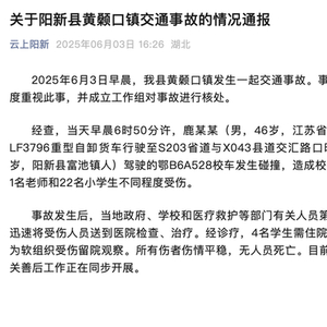 湖北省黄石市阳新县教育局发布通报称,6月3日早晨,该县黄颡口镇发生一起交通事故。事发后,县委、县政府高度重视此事,并成立工作组对事故进行核处。