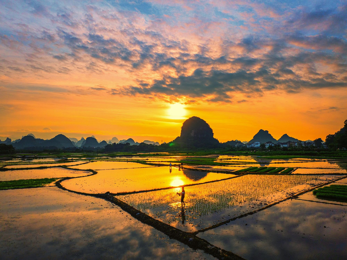 “手把青秧插满田,低头便是水中天”。阳朔县乌龙村农户抢抓农时插种秧苗,生动诠释了“劳动的美”。(阳朔县纪委监委供 夏立慧/摄)