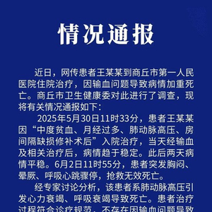 河南商丘市卫健委6月5日通报,近日,网传患者王某某到商丘市第一人民医院住院治疗,因输血问题导致病情加重死亡。商丘市卫生健康委对此进行了调查,现将有关情况通报如下:2025年5月30日11时33分,患者王某某因“中度贫血、月经过多、肺动脉高压、房间隔缺损修补术后”入院治疗,当天经输血及相关治疗后,病情趋于稳定。此后两天病情平稳。6月2日11时55分,患者突发胸闷、晕厥、呼吸心跳骤停,抢救无效死亡。经专家讨论分析,该患者系肺动脉高压引发心力衰竭、呼吸衰竭导致死亡。患者治疗过程符合诊疗规范,不存在因输血问题导致病情加重死亡的情况。患者家属对调查结论予以认可。