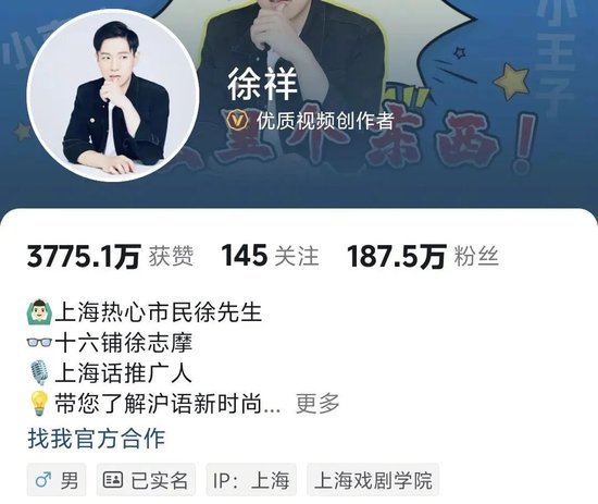 公开资料显示,徐祥,上海沪剧院青年演员,沪语推广人 。2020年2月在抖音推广上海话,用上海话演绎生活、上海话翻唱经典歌曲的方式掀起了上海话潮流。