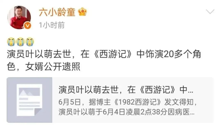 6日下午,六小龄童确认并转发这一消息,发文悼念:演员叶以萌去世,在《西游记》中饰演20多个角色,带上话题词#《西游记》二王子饰演者叶以萌去世#。