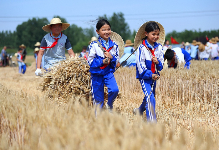 青岛即墨区灵山牛齐埠小学的小学生体验收小麦。