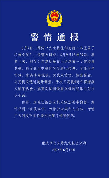 ·重庆一男子小区内尾随女童进电梯,警方通报:男子已被刑事拘留。