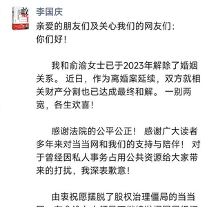 南方财经6月13日电,据界面新闻,6月13日,当当网创始人李国庆在社交平台发文称,“我和俞渝女士已于2023年解除了婚姻关系。近日,作为离婚案延续,双方就相关财产分割也已达成最终和解。”