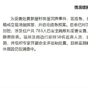 为妥善处置郭屋村房屋沉降事件,区应急、住建以及属地街道等单位已于6月16日晚成立现场指挥部,并启动应急预案。目前已对沉降房屋及周边区域房屋共计25栋进行封控,涉及住户共783人已安全疏散和妥善安置,对房屋邻近的天成学校停课一天进行隐患排查。现场及周边已安排50名巡查人员,设置了95个监测点进行24小时巡查监测,并组织专家开展安全评估和处置。目前监测数据平稳,暂未发现新的异常情况。具体原因仍在调查中。