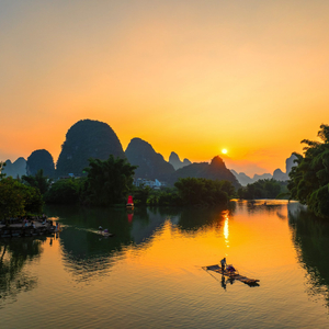 夏至黄昏,遇龙河畔晚霞熔金,天际泼彩倾泻河面,竹筏轻漾载翠影婆娑,落日余晖与云霞共舞,山水相融如泼墨长卷徐徐展开。(阳朔县纪委监委供 夏立慧/摄)