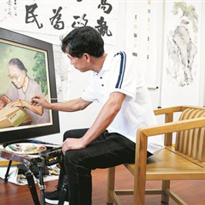 图为刘兴彪在福建谷文昌干部学院画室创作油画《慈祥的母亲》。