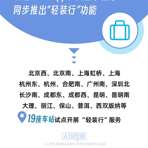 今年以来,针对旅客携带大件行李出行不便的情况,铁路部门在广泛听取各方意见、深入开展市场调研的基础上,统筹运用车站场地、装备、人员等资源,研究设计了以为旅客提供“门到站”“站到门”行李搬运为主要内容的“轻装行”服务项目。自6月28日起在北京西、北京南、上海虹桥、上海、杭州东、杭州、合肥南、广州南、深圳北、长沙南、成都东、成都西、昆明、昆明南、大理、丽江、保山、普洱、西双版纳等19座车站试点开展“轻装行”服务。