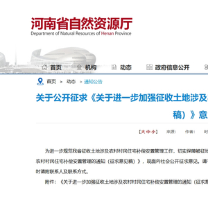 近日,为进一步规范河南省征收土地涉及农村村民住宅补偿安置管理工作,河南省自然资源厅研究起草了《关于进一步加强征收土地涉及农村村民住宅补偿安置管理的通知(征求意见稿)》,现面向社会公开征求意见。