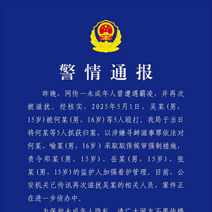 重庆忠县公安局微信公众号“平安忠县”7月9日消息,昨晚,网传一未成年人曾遭遇霸凌,并再次被滋扰。经核实,2025年5月1日,吴某(男,15岁)被何某(男,16岁)等5人殴打。我局于当日将何某等5人抓获归案,以涉嫌寻衅滋事罪依法对何某、喻某(男,16岁)采取取保候审强制措施,责令郑某(男,15岁)、岳某(男,15岁)、张某(男,15岁)的监护人加强看护管理。目前,公安机关已传讯再次滋扰吴某的相关人员,案件正在进一步侦办中。