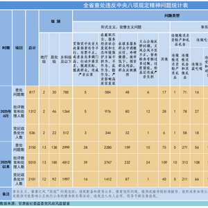 7月8日,甘肃省纪委监委公布了2025年6月全省查处违反中央八项规定精神问题汇总情况。当月,全省共查处违反中央八项规定精神问题817起,批评教育和处理1312人,其中党纪政务处分536人。
