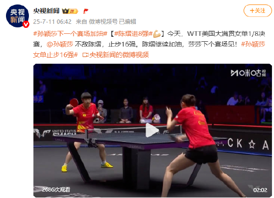 今天,WTT美国大满贯女单1/8决赛,孙颖莎不敌陈熠,止步16强。陈熠继续加油,莎莎下个赛场见!
