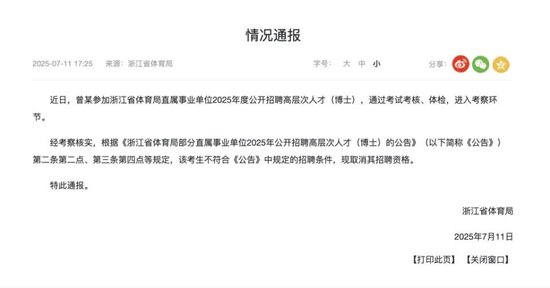 通报称,近日,曾某参加浙江省体育局直属事业单位2025年度公开招聘高层次人才(博士),通过考试考核、体检,进入考察环节。经考察核实,根据《浙江省体育局部分直属事业单位2025年公开招聘高层次人才(博士)的公告》(以下简称《公告》)第二条第二点、第三条第四点等规定,该考生不符合《公告》中规定的招聘条件,现取消其招聘资格。