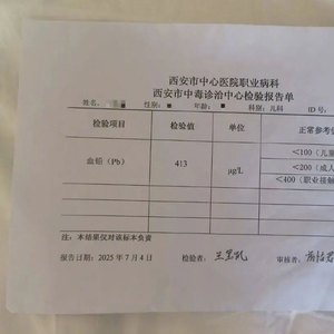 耿伟(化名)孩子在西安市中心医院7月4日和7月11日的两次检验中,血铅浓度分别为413微克/升和305微克/升。图/受访者提供。