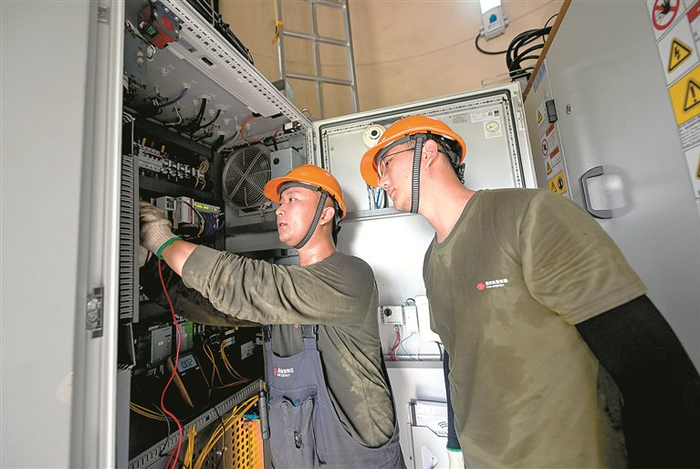 连日来,天津迎来持续高温天气,电力保供进入“迎峰度夏”关键期。图为近日,在国家能源集团天津龙源新能源有限公司大苏庄风电场,工作人员在风电机组内检查变电设备。  新华社记者 赵子硕 摄