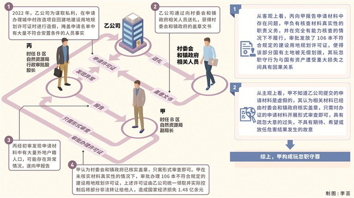 武清华:根据《中华人民共和国行政许可法》第三十四条规定,行政机关应当对申请人提交的申请材料进行审查。需要对申请材料的实质内容进行核实的,行政机关应当指派两名以上工作人员进行核查。本案中,B区自然资源局在审批发放建设用地规划许可证时具有审慎审查义务。该局行政审批股股长丙初审后发现申请材料中有大量外地户籍人口,可能存在问题,向甲报告后,甲未指派两名以上工作人员进行核查或者向上一级主管部门上报问题,而是直接审批同意,将该部分国有土地以无偿划拨方式发放给106户不符合条件的外地户籍人口(相关许可证由乙公司统一领取并部分非法转让获得巨额利益),造成国有资产重大损失,构成玩忽职守罪。