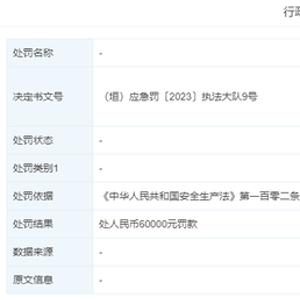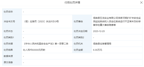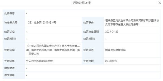 天眼查显示,垣曲县五龙实业有限公司洛家河铜矿成立于2001年。2023年12月,五龙实业有限公司洛家河铜矿因“矿井安全监测监控系统和人员定位系统运行不正常未及时修复存在重大事故隐患等”,被垣曲县应急管理局罚款6万元。2024年4月,五龙实业有限公司洛家河铜矿又因“现状图纸与实际不符存在重大事故隐患等”,受到垣曲县应急管理局的行政处罚,罚款金额29万元。