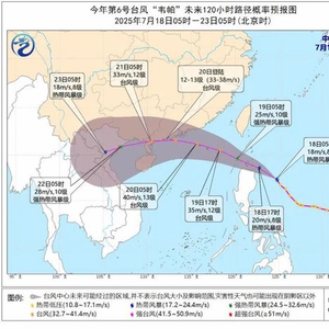 大风预报:7月18日08时至19日08时,受“韦帕”和西南季风的共同影响,南海大部、巴士海峡、台湾海峡、台湾以东洋面、东海南部将有6至7级大风、阵风8至9级,南海东北部偏东海域、巴士海峡、台湾海峡风力有8至9级,阵风10至11级,台风中心经过的附近海域风力有10级,阵风11至12级。