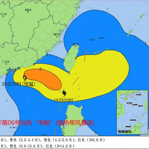 央视网消息:国家海洋预报台7月19日8时发布海浪黄色警报:受今年第6号台风“韦帕”(强热带风暴级)的影响,预计:7月19日中午到20日中午,南海东北部将出现5到7米的巨浪到狂浪区,台湾海峡、巴士海峡将出现3到5米的大浪到巨浪区,近海海域海浪预警级别为黄色;广东近岸海域将出现2.5到4米的大浪到巨浪,该近岸海域海浪预警级别为黄色,浙江南部、福建近岸海域将出现2到3米的中浪到大浪,该近岸海域海浪预警级别为蓝色。请在上述海域作业的船只注意安全,沿海各有关单位提前采取防浪避浪措施。