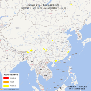 2025年7月19日20时至20日20时,内蒙古东北局部、浙江南部局部、福建东北局部、广东东部局部和南部局部、四川东南局部、云南东北局部、西藏东南局部、陕西中部局部发生地质灾害的风险较高(黄色预警)。