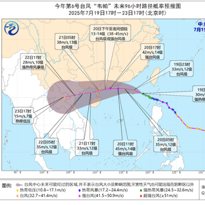 降水预报:7月19日20时至20日20时,海南岛、广东中南部、广西东南部、福建东部、浙江南部、江西西南部、湖南南部、台湾岛大部等地有大到暴雨,其中,广东西南部、海南岛北部、台湾岛东部等地的部分地区有大暴雨,广东西南部沿海、海南岛东北部等地局地有特大暴雨(250~280毫米)。上述部分地区伴有短时强降水(最大小时降雨量20~50毫米,局地可超过80毫米),局地有雷暴大风等强对流天气。