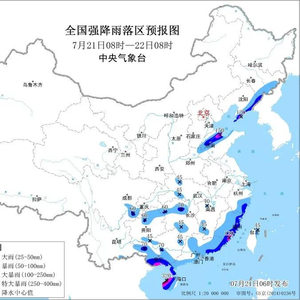 预计,7月21日08时至22日08时,广东中东部和西南部、香港、澳门、海南岛、广西南部和西部、福建中东部、浙江东南部、江西西部、湖南西部和南部、湖北西部、台湾岛东部以及吉林东南部、辽宁东部和南部、山东中北部、河南北部、四川盆地南部、重庆南部、贵州北部和西南部、云南东南部等地有大到暴雨,其中,广东雷州半岛、海南岛中西部和北部、广西东南部沿海、辽宁东南部、山东北部等地的部分地区有大暴雨,海南岛西北部等地局地有特大暴雨(250~320毫米)。上述部分地区伴有短时强降水(最大小时降水量20~50毫米,局地可达90毫米以上),局地有雷暴大风等强对流天气。