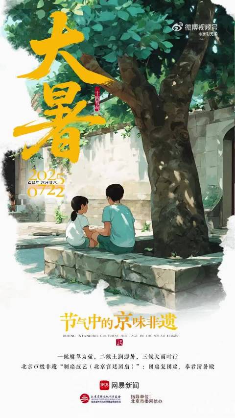 2025年7月22日21时29分,大暑至。蝉声不歇,暑气正盛,湿热交织,正是万物蓄力生长的极致时节。老北京伏天食俗,饽饽面蛋,酸梅解暑,在盛夏烟火中静享时光。而京西匠人则于热浪中潜心制扇——熬竹骨、绷细绢,绘扇面,风骨与凉意在扇间缓缓展开。大暑虽热,却也丰盈,愿你在炙热中沉稳积蓄,于盛夏之中,摇出自己的清凉与从容。