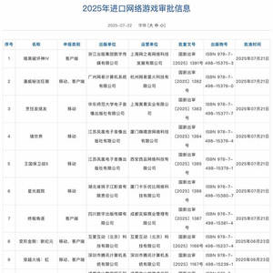国家新闻出版署发布2025年进口网络游戏审批信息,7月共7款进口游戏获批。