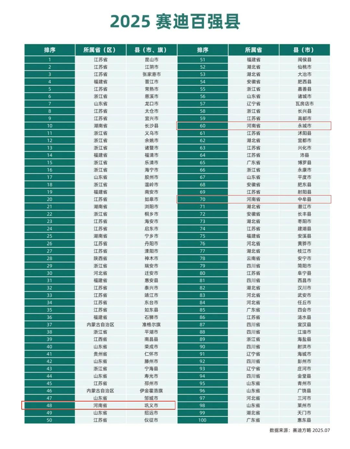 7月23日,2025县域经济创新发展论坛在北京举行。赛迪顾问发布2025赛迪百强县市榜单。其中,河南3地上榜,包括:巩义市(48位)、永城市(60位)、中牟县(70位)。