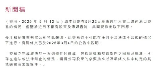 长江和记实业有限公司特此声明,此交易绝不可能在任何不合法或不合规的情况下进行。有关条文已于2025年3月4日的公告中说明:“交易之完成取决于一系列条件的达成,包括法律和监管部门之同意及批准、不存在违法或法律禁止的情况、获得公司股东的必要批准以及最终文件中约定的其他适当及常规条件。”