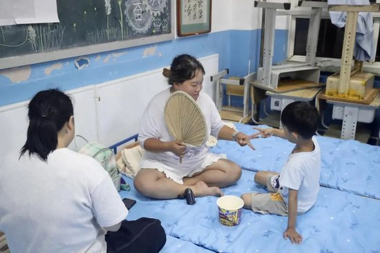 随着第一批转移群众的到来,工作人员正在楼上楼下忙着帮被转移的群众搬行李、铺被褥,整理卫生。几位老年人在屋内的小桌上打起了扑克牌,放松身心。村里的工作人员帮他们一家铺好被褥,并发放了矿泉水、方便面等食品。