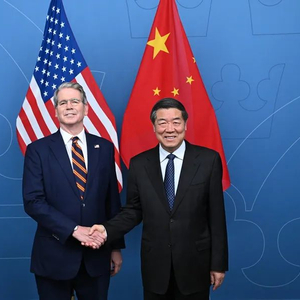 7月28日,中美两国经贸团队在瑞典斯德哥尔摩举行中美经贸会谈。会谈前,中共中央政治局委员、国务院副总理何立峰与美国财政部长贝森特握手。图/新华