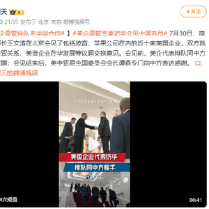 [美企高管排队来华谈合作 ]美企高管密集访华会见中国官员。 7月30日,商务部部长王文涛在北京会见了包括波音、苹果公司在内的近十家美国企业,双方就中美经贸关系、美资企业在华发展等议题交换意见。会见前,美企代表排队同中方握手寒暄;会见结束后,美中贸易全国委员会会长谭森专门向中方表达感谢。