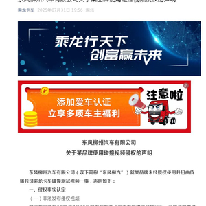 据东风柳州汽车有限公司:东风柳州汽车有限公司(以下简称“东风柳汽”)就某品牌未经授权使用并扭曲传播我司乘龙卡车碰撞测试视频一事,声明如下:一、侵权事实认定(一)非法发布侵权视频某汽车品牌在2025年7月29日发布与乘龙卡车正面碰撞视频的行为,已构成严重侵权,并超过正常商业竞争范畴,严重误导和损害公众知情权,对我司品牌及商业名誉带来了巨大负面影响,涉嫌违反《反不正当竞争法》《广告法》及《民法典》等相关法律。(二)某汽车品牌使用特定场景测试,与实际场景运营存在严重差异截至目前我司了解到的情况,某汽车品牌未公开测试车辆状况(双方车辆是否改装、减配、卡扣是否固定、车辆是否过检等)、场景环境(测试场地状况、车速、驾驶状态等),通过自定义碰撞条件,特定设计非常规测试场景,发布与公众认知的正常碰撞结果偏差较大的碰撞视频,不仅贬低我司品牌形象,还容易对广大车主造成误导,形成安全隐患。二、乘龙品牌技术说明东风柳汽作为一家有71年历史的央国企,始终以用户需求为导向,乘龙卡车安全体系严格遵循“真实场景防护”原则:(一)行业首创龙骨框架驾驶室;(二)采用四层吸能结构(抗冲击层→缓冲层→高强骨架→柔性防护层),通过多通道传导专利技术分散碰撞能量,最大化保障驾乘安全;(三)主动安全双重防线:AEBS自动紧急制动系统(主动预防)+驾驶室后移技术(被动防护),有效降低事故伤亡率。三、致行业与卡友用户东风柳汽作为央国企,积极响应国家部委及中汽协关于反内卷、反不正当竞争的号召,坚决反对任何通过贬损同业、恶意攀比等破坏行业生态的行为,致力于推动公平有序的市场环境。我们倡议行业同仁共同践行:安全为本:严格遵守交通法规,定期做好车辆维保,强化主动预防意识——这比任何测试都更能筑牢安全防线!诚信竞争:恪守商业道德,以技术创新和品质提升驱动行业进步,共同维护健康可持续的产业生态!理性传播:不过分炒作扩大,不被流量诱惑;不被某品牌利用,借机放大影响力。四、后续追责 我司对此事高度关注,将持续关注此事件,本着专业、严谨、负责的态度成立专项组进行进一步研究,并对此事造成的影响,保留追究法律责任的权利。