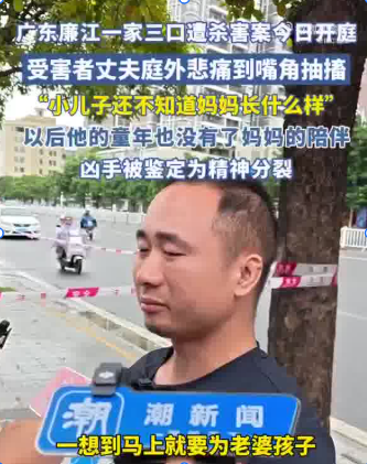 广东廉江一家三口遭杀害案今日开庭,两个月的小儿子因在睡梦中逃过一劫,受害者丈夫庭外悲痛到嘴角抽搐:小儿子还不知道妈妈长什么样,以后他的童年也没有了妈妈的陪伴,凶手被鉴定为精神分裂。