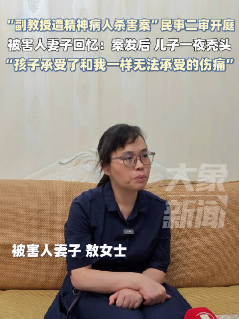 8月19日上午,“副教授遭精神病人杀害案”民事二审开庭。当天上午,在进入法院前,被害人王某平的妻子敖女士向大象新闻记者回忆4年前丈夫遇害时情景:案发当天,她突然得知丈夫死讯,浑身瘫软麻木,哭不出声;案发后,她抱着儿子大哭,发现儿子一夜秃头:“孩子承受了和我一样无法承受的伤痛”。