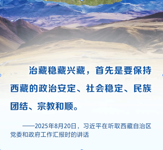 2025年8月20日,习近平总书记率中央代表团乘专机抵达拉萨,出席西藏自治区成立60周年庆祝活动。在听取西藏自治区党委和政府工作汇报时,习近平总书记强调,“持续深入抓好稳定、发展、生态、强边四件大事,努力建设团结富裕文明和谐美丽的社会主义现代化新西藏”。