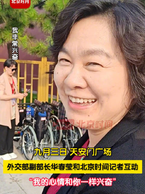 九月三日,北京天安门广场。外交部党委委员、副部长华春莹和北京时间记者互动:“我的心情和你一样兴奋。”(记者 李鹏毅)
