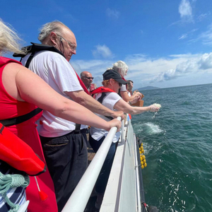 2024年6月,浙江舟山东极岛附近海域的一艘船上,75岁的丹妮丝·维尼和同船的人们一道,将手里的白色花瓣撒向大海。