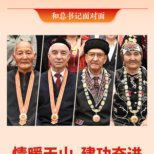 接见现场,83岁的“人民楷模”布茹玛汗·毛勒朵穿着柯尔克孜族传统衣裙,头戴花巾,脸上布满岁月风霜刻下的皱纹。
