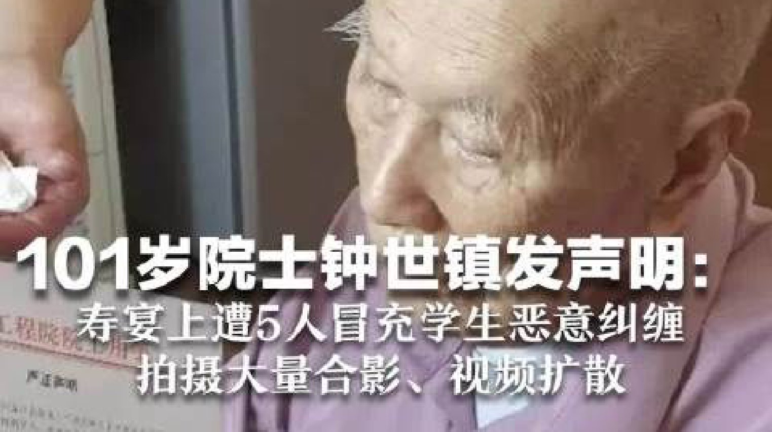 10月11日,我国解剖学泰斗、中国工程院院士、中国临床解剖学创始人、中国数字人和数字医学倡导者钟世镇院士办公室10月11日发来由百岁院士手书签字并委托发布的严正声明一份。声明中指出,钟院士百岁生日时被冒充学生的杨炯等五人纠缠拍摄了大量的合影和视频,并扩散于他们的朋友圈和工作场所等公开场合,招摇撞骗企图给公众造成“师出名门、行业翘楚、学术权威”假象。