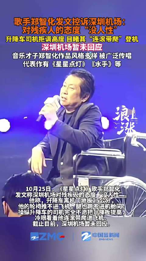 10月25日,歌手@郑智化 发文控诉称,其在深圳机场登机时,因升降车停离机门地板25公分,轮椅推不进飞机,只能连滚带爬进飞机。随后,@深圳机场 在评论区致歉,并表示已第一时间会同航空公司启动核查。