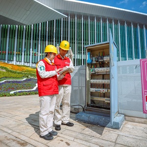 国网上海电力员工在国家会展中心南广场检查末端用电设备运行情况。